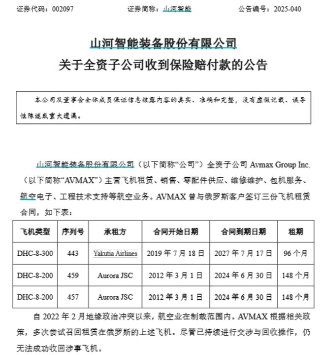 在俄罗斯滞留三架租赁飞机后,Shanhe智能终于获得了保险。 Shanhe Intelligent于去年获得了1.64亿元的保险范围,净收益为7300万元。 8月11日,Shanhe Intellighent Equipment Co.,Ltd。宣布其Avmax Absolute物业子公司已与俄罗斯客户签署了三项飞机租赁协议。自2022年2月的地缘政治纠纷以来,航空业一直处于制裁范围内。根据相关政策,阿夫马克斯(Avmax)试图记住以前在俄罗斯租用多次的飞机。尽管进行了持续的谈判和回收操作,但涉及的飞机仍无法恢复到正常状态。 Shanhe Intelligent,Avmax和飞机保险公司最近的一项公告确认,Avmax可以从保险公司获得,并且扣除律师税率后确定的税率为29.6.6亿美元。目前,Avmax收到了我Nsurance薪酬来自2,9.6.6亿美元。根据人民币汇率,这成为8月8日至8月8日至1.64亿元人民币的平均美元价格。上一年的股东。 Avmax在早期阶段就在这三个飞机上施加了完全的障碍。这种补偿是意外补偿,不是连续的,但不是反复的收益和损失。公共信息显示,Shanhe智能设备集团由其南部中部大学教授的教授Qingdao于1999年成立。这是广东工业投资控股集团有限公司,全球财富500强公司。它是一个子公司。 Shanhe Intellighent Equipment Co.,Ltd。是一家引用的公司。通过发展一个国际业务集团,其目标是长沙作为总部,它是国际商业在国内和国际上的特定特定影响力。 4月25日,Shanhe Intelligent(002097)公司于2025年发布了其第一季度。纽约的运营收益为15.1亿元人民币,与上一年相比下降了9%。股东归因的净收入为32.6亿元人民币,比上一年增加了57.3%。我添加了。去年同期,股东的净收入为2750万元,股东的净收入为891万元人民币。净营业现金流量为-4.34亿元人民币,年龄增长6.8%。自第一季度末以来,该公司的总资产为216.37亿元人民币,自上年底以来增长了3.2%。股东可归因于股东的净资产为4733亿元人民币,比上年底为1.4%。在2024年,该公司的运营收益为7,19亿元人民币,比上一年下降了1.53%。造成贸易公司股东的净收入为729.9.96亿元人民币,比较增加了46.03%到上一年。每项行动的基本利润为每股0.0679元,比上一年增加了46.02%。 7月10日,Shanhe Intellignent Eavensaas的绝对财产子公司Avmax Aircraft Leasing Inc.与澳航签署了两项“飞机销售协议”,购买了16 DHC-8 300涡轮螺旋桨飞机。资产购买的总价为51,1.4.2亿美元,并以现金支付。预计将是2025年,并将在2018年12月31日之前在批次中交付。交易是尽职调查,没有资本或流动性的风险,但存在商业中断的风险。这张照片显示了Avidhc-8-400(照片来源:Visual Chine),根据两党最近签署的合同。在这笔交易中,将交付16批次。预计所有交货将在2025年12月31日之前完成。澳大利亚塔姆沃思地区机场的当事方将在澳大利亚进行谈判。 Avmax被Shanhe Intelligent收购2016年。自2016年以来,Shanhe Intelligent已单独列出了航空业务领域的收入。从商业百分比的角度来看,Shanhe Smart Aviation业务部门的收入参与2017年达到27.49%,这使其成为近年来的最高价值。自2017年以来,Shanhela的智能航空业务部门的薄荷收入参与已连续第四年减少,2021年下降至5.41%。自2022年以来,Shanhe智能航空业务的收入规模逐年逐年分段,收入参与的收入和收入的收入更高,并在最近的14.24%中获得了14.24%的收入超过10%,达到14.24%。 Shanhe智能股票的价格突然上涨。在截至7月21日的16天谈判中,Shanhe Intelligent每天增加了9倍的限制,在此期间累计增长了116%,达到了目前的市场价值192亿元人民币。回答投资者有关I的问题Shanhe Intelligent在8月11日的Nteractive平台表示,自2025年8月8日关闭时,该公司的所有者人数为245,046。 Rifa Precision机械因在俄罗斯被捕而被保险起诉。 On June 26 of this year, Zhejiang Rifa Precision Machinery Co., Ltd. (hereinafter, called “Rifa Precision Machinery”, 002520.SZ) is Airwork Ireland Limited, a subsidiary of Airwork Limited, a subsidiary of COCompany’s Mallia on the airline (Australia) Limited and Aon Nz in Auckland High Court in the company’s naquera court.需求已被正式接受。 QBE或QBE保险(澳大利亚)有限公司; Aon NZ或Aon New Zealand Company是Aon Holdings New Zealand公司的子公司,隶属于Aon Plc。 Aon NZ是保险走廊和攻击顾问。 Rifa Precision Machinery在公告中说,航空工程和俄罗斯客户Abiastar已签署了租金协议,总共有六架B757-200负载飞机。在西方地理之后ICAL冲突,欧盟,美国,新西兰和其他国家进行了相互制裁。因此,空气和俄罗斯邮件客户必须完成合作。航空工作在2022年3月向俄罗斯客户终止合作通知,并要求他们返回前刨床。收到另一方的回应后,空中邮件反复结束了租约。位置由航空公司在国外指定。飞机的工作恢复了一架飞机(飞机序列号:MSN27051),其子公司中的飞机试图以多种方式恢复五架飞机,而这些飞机都没有成功。飞行器在2022年9月底收到了俄罗斯客户的回应,称基于俄罗斯政府的当前制裁政策,几乎不可能返回前飞机。到目前为止,上述五架飞机已在俄罗斯被捕。根据保险合同由飞机的工程和保险公司的公司点燃,航空邮件和保险公司通过有关逮捕上述飞机的逮捕而为保险承保范围而战。目前,当事方尚未达到万日。经过仔细的讨论,空军认为可以通过诉讼来完成。因此,为了保护股东的权利和利益,飞机已在法院提起诉讼,尚未确定索赔金额。值得一提的是,在2022年10月,里法克斯的机械使资产恶化条款中的五架波音757架飞机被航空公司拘留在俄罗斯,留下了7.41亿元人民币。 (本文并不构成投资建